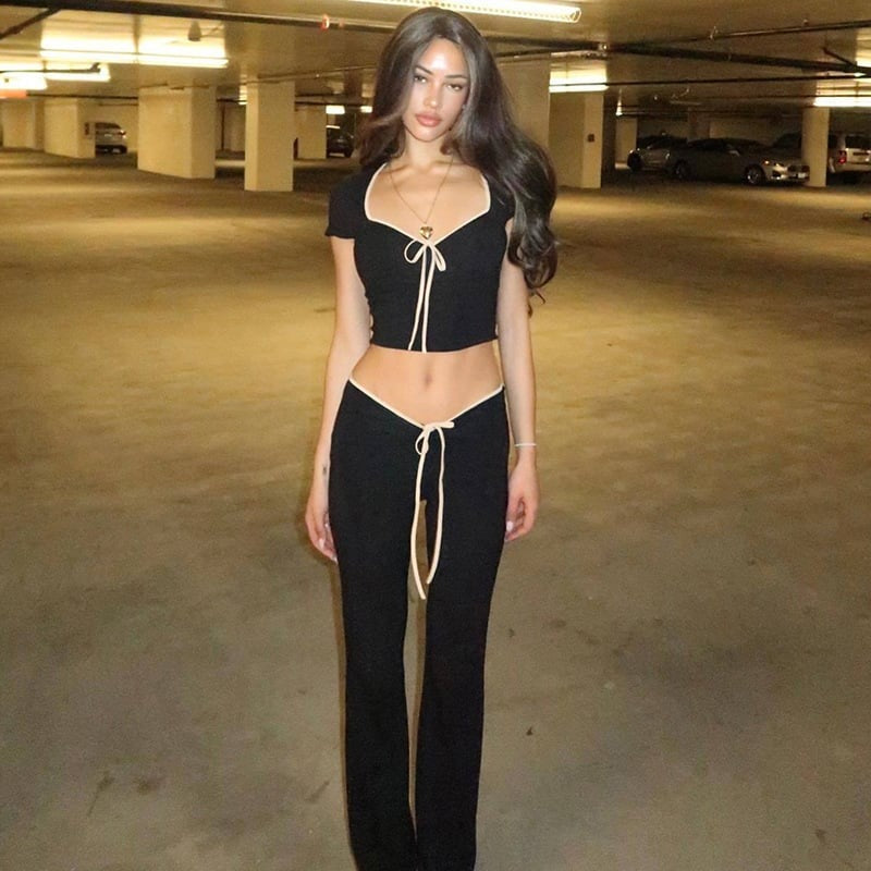 Contrast Color Square Neck T-shirt Low Waist Flared Leggings Set
