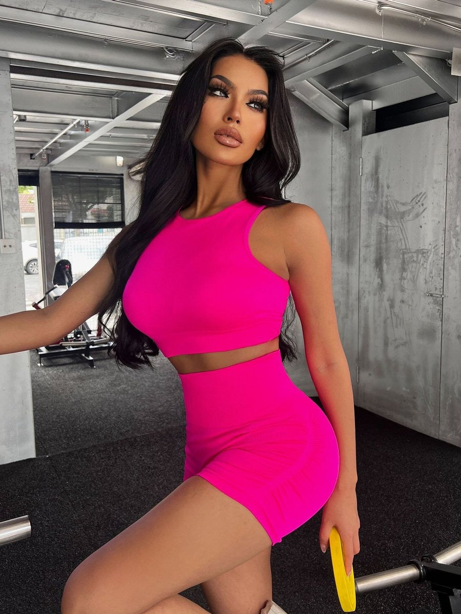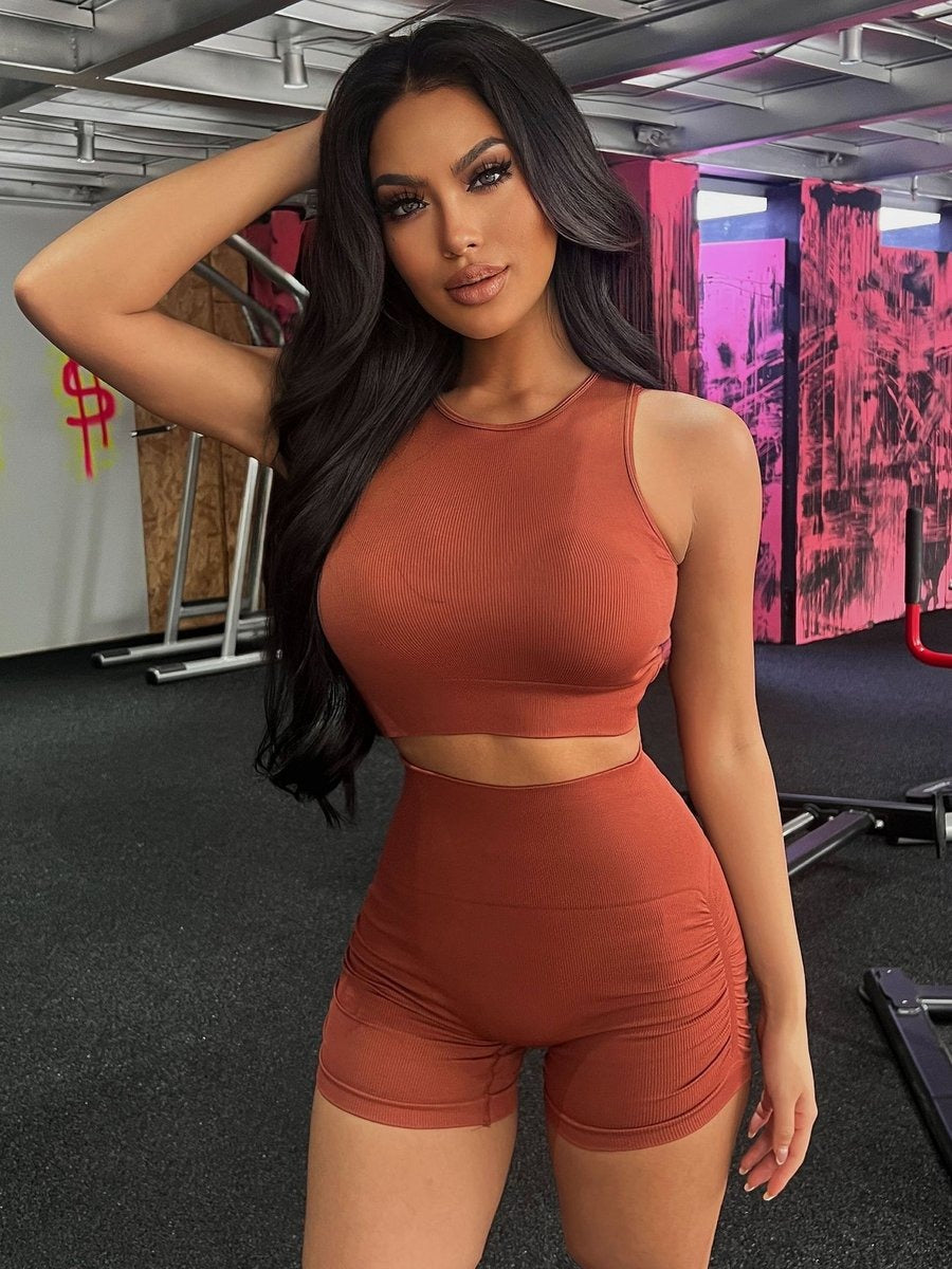 Cross Hollow Solid Color Hip Lifting Yoga Bra Shorts Set With Chest Pads